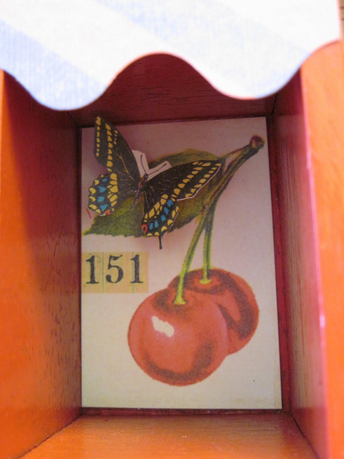 Oooh! I LOVE this and now I want to make one too! This is so fresh and charming. The red background is perfect and each item is just wonderful! Thanks for sharing...GREAT JOB!!!